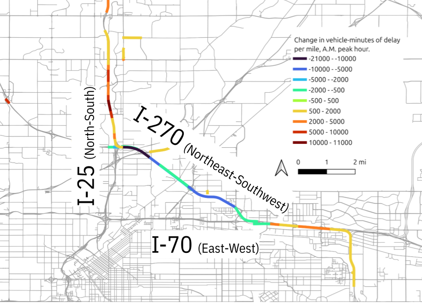 We found that adding new toll lanes to I-270 would have no net benefit to regional congestion. It might alleviate congestion on I-270, but it would just make traffic worse on all the roads that connect to I-270, especially I-25.